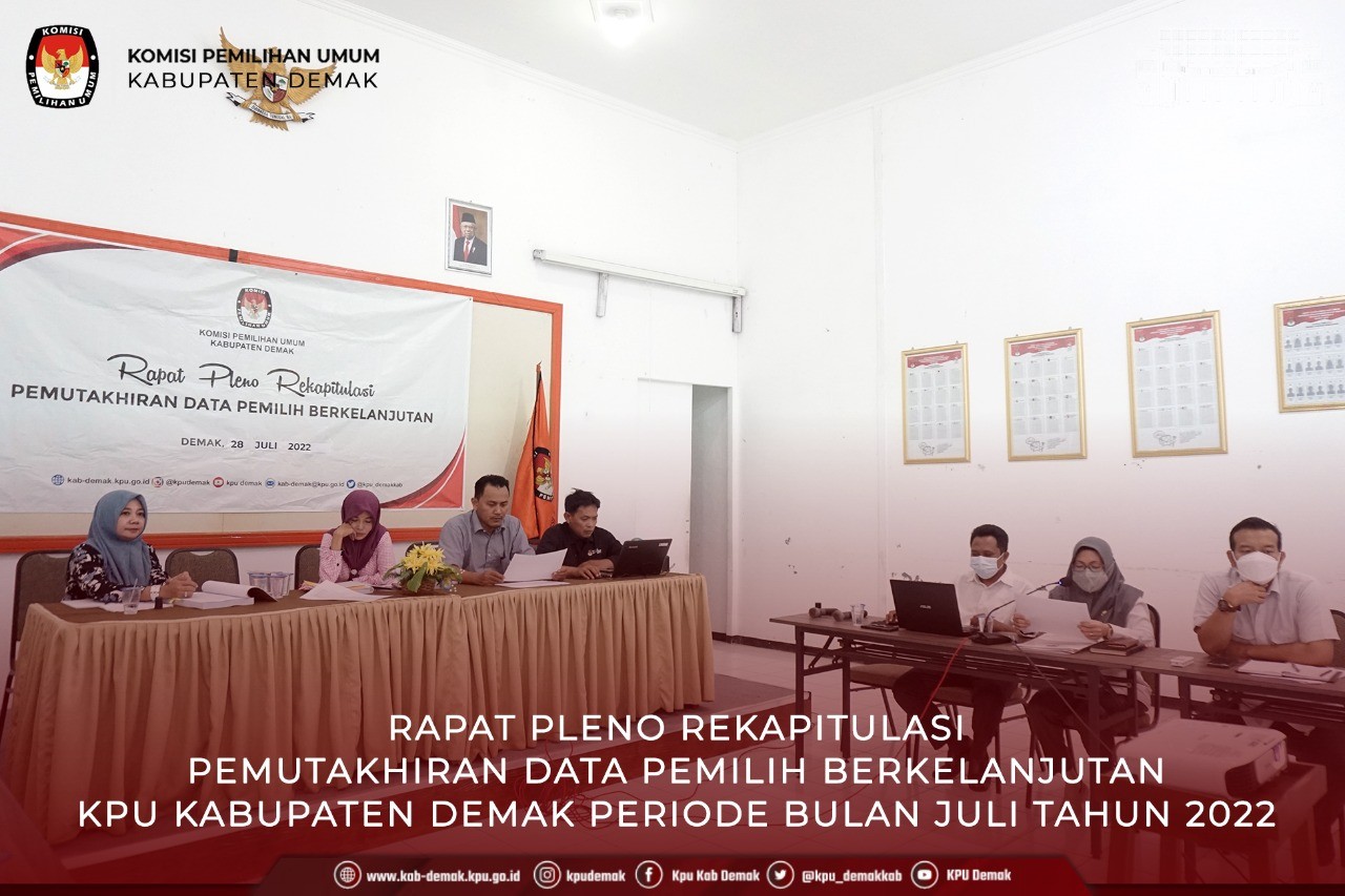 Rekapitulasi Daftar Pemilih Berkelanjutan Bulan Juli disampaikan oleh Anggota KPU Kabupaten Demak Divisi Perencanaan Data dan Informasi, Nur Hidayah dan dituangkan dalam Berita Acara Nomor: 53/PL.02.1-BA/3321/2022 tanggal 28 Juli Tahun 2022 tentang Rekapitulasi Daftar Pemilih Berkelanjutan Tahun 2022 Periode Juli dengan hasil sebagai berikut: Sebanyak 372 pemilih yang dinyatakan TMS, pemilih laki-laki 206 dan pemilih perempuan 166; Sebanyak 542 pemilih baru, pemilih laki-laki 313 dan pemilih perempuan 229; Perbaikan Data Pemilih sebanyak 54, Pemilih laki-laki 27 dan pemilih perempuan 27 sehingga Daftar Pemilih Berkelanjutan periode Juli 2022 jumlah pemilih laki-laki sebanyak 425.410 dan pemilih perempuan sebanyak 425.976, dengan total sebanyak 851.386 pemilih. Pemutakhiran Daftar Pemilih Berkelanjutan periode Juli ini adalah hasil pencermatan internal KPU Kabupaten Demak, masukan dari Kodim 0716, Pengadilan Agama Kabupaten Demak, Dinas Kependudukan dan Catatan Sipil Kabupaten Demak, Dinas Pendidikan dan Kebudayaan Provinsi Jawa Tengah Cabang Dinas Pendidikan Wilayah II, Rumah Tahanan Kabupaten Demak, dan masyarakat Kabupaten Demak.