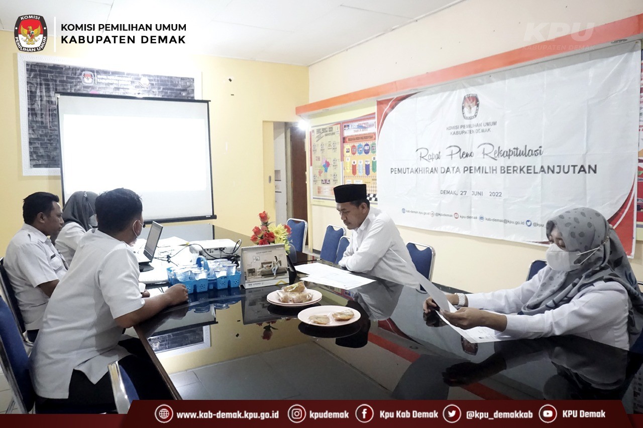 Penyampaian Rekapitulasi Daftar Pemilih Berkelanjutan oleh Ketua KPU Kabupaten Demak dan dituangkan dalam Berita Acara Nomor: 45/PL.02.1-BA/3321/2022 tanggal 27 Juni Tahun 2022 tentang Rekapitulasi Daftar Pemilih Berkelanjutan Tahun 2022 Periode Juni dengan hasil sebagai berikut : Sebanyak 165 pemilih yang dinyatakan TMS terdiri dari 86 pemilih laki-laki dan 79 pemilih perempuan; Sebanyak 3 pemilih baru terdiri dari 2 pemilih laki-laki dan 1 pemilih perempuan; sehingga Daftar Pemilih Berkelanjutan periode Juni 2022 jumlah pemilih laki-laki sebanyak 425.303 dan pemilih perempuan sebanyak 425.913, dengan total sebanyak 851.216 pemilih. Pemutakhiran Daftar Pemilih Berkelanjutan periode Juni ini adalah hasil masukan dari Polres Demak, Kodim 0716, Bawaslu Kabupaten Demak, dan Pemerintah Desa.