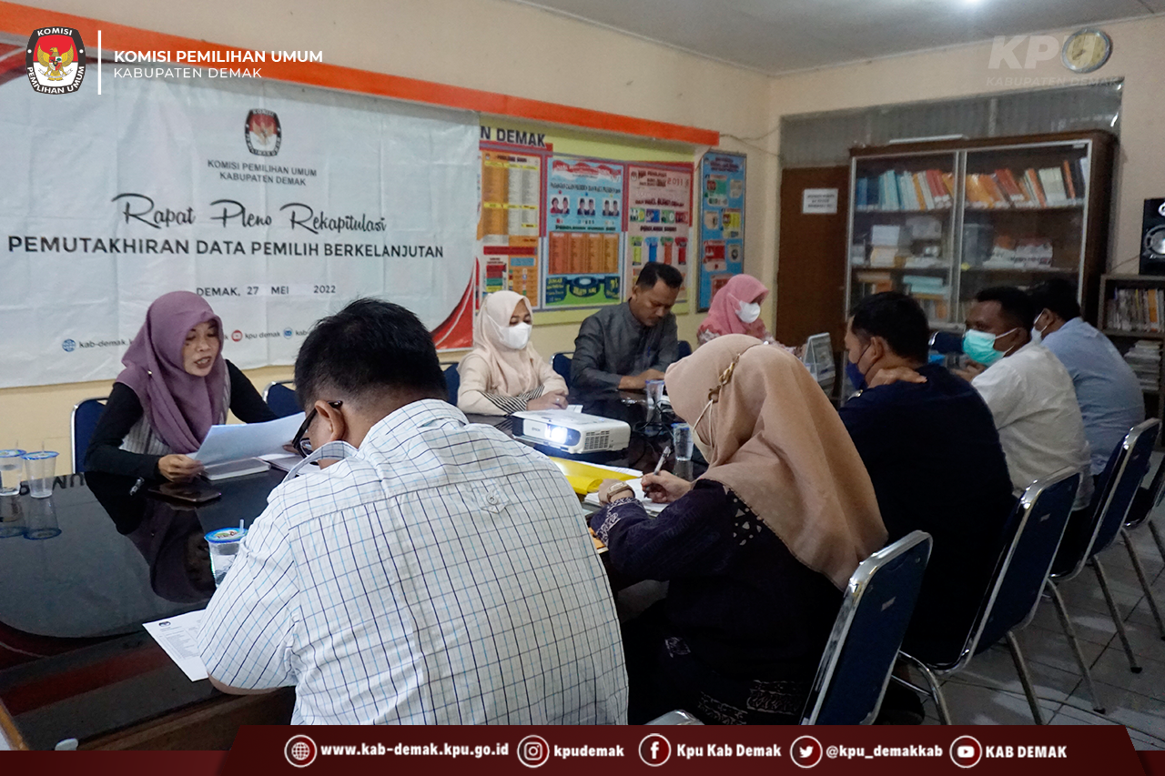 Penyampaian Rekapitulasi Daftar Pemilih Berkelanjutan oleh Anggota KPU Kabupaten Demak Divisi Perencanaan Data dan Informasi, Nur Hidayah dan dituangkan dalam Berita Acara Nomor: 33/PL.02.1-BA/3321/2022 tanggal 27 Mei 2022 tentang Rekapitulasi Daftar Pemilih Berkelanjutan Tahun 2022 Periode Mei dengan hasil sebagai berikut: sebanyak 354 pemilih yang dinyatakan TMS, pemilih laki-laki sebanyak 175 dan pemilih perempuan sebanyak 179; sehingga Daftar Pemilih Berkelanjutan periode Mei 2022 jumlah pemilih laki-laki sebanyak 425.387 dan pemilih perempuan sebanyak 425.991, dengan total sebanyak 851.378 pemilih. Pemutakhiran Daftar Pemilih Berkelanjutan periode Mei ini adalah hasil masukan dari Rumah Tahanan Demak dan Pemerintah Desa di Kabupaten Demak.