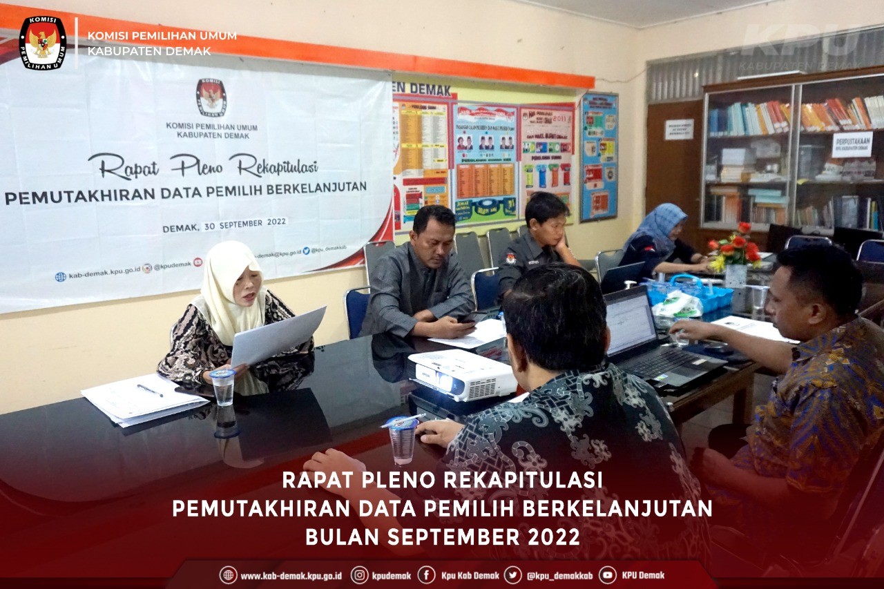 Rekapitulasi Daftar Pemilih Berkelanjutan Bulan September disampaikan oleh Anggota KPU Kabupaten Demak Divisi Perencanaan Data dan Informasi, Nur Hidayah dan dituangkan dalam Berita Acara Nomor: 81/PL.02.1-BA/3321/2022 tanggal 30 September Tahun 2022 tentang Rekapitulasi Daftar Pemilih Berkelanjutan Tahun 2022 Periode September dengan hasil sebagai berikut : Sebanyak 4.874 pemilih yang dinyatakan TMS dengan rincian laki-laki 2.585 pemilih dan perempuan 2.289 pemilih; Sebanyak 21.597 pemilih baru dengan rincian laki-laki 11.090 pemilih dan perempuan 10.507 pemilih; Perbaikan Data Pemilih sebanyak 345 pemilih dengan rincian laki-laki 180 pemilih dan perempuan 165 pemilih sehingga Daftar Pemilih Berkelanjutan periode September 2022 sebanyak 867.105 pemilih dengan rincian laki-laki sebanyak 433.384 pemilih dan perempuan sebanyak 433.721 pemilih. Pemutakhiran Daftar Pemilih Berkelanjutan periode September ini adalah hasil pencermatan internal KPU Kabupaten Demak dan masukan dari Kodim 0716/Demak, Polres Demak, Bawaslu Kabupaten Demak dan Pengadilan Agama Kabupaten Demak.