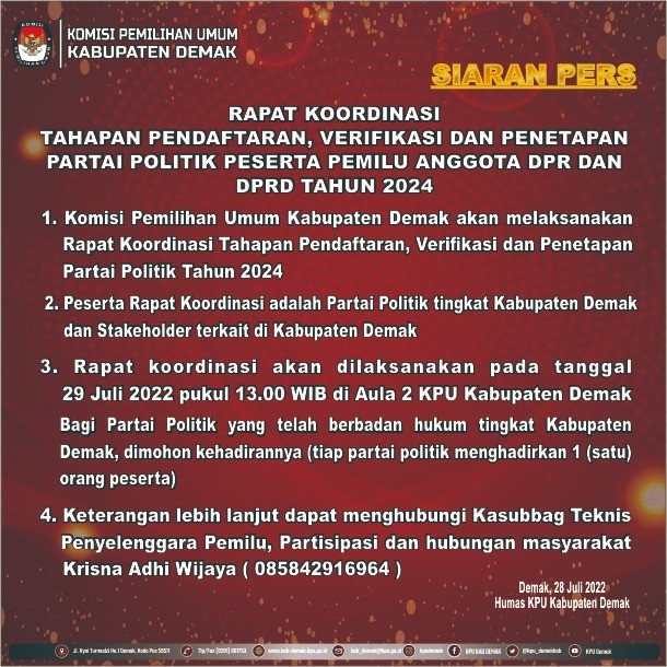 Siaran Pers: Rapat Koordinasi Tahapan Pendaftaran, Verifikasi, dan Penetapan Partai Politik Peserta Pemilu Anggota DPR dan DPRD Tahun 2024
