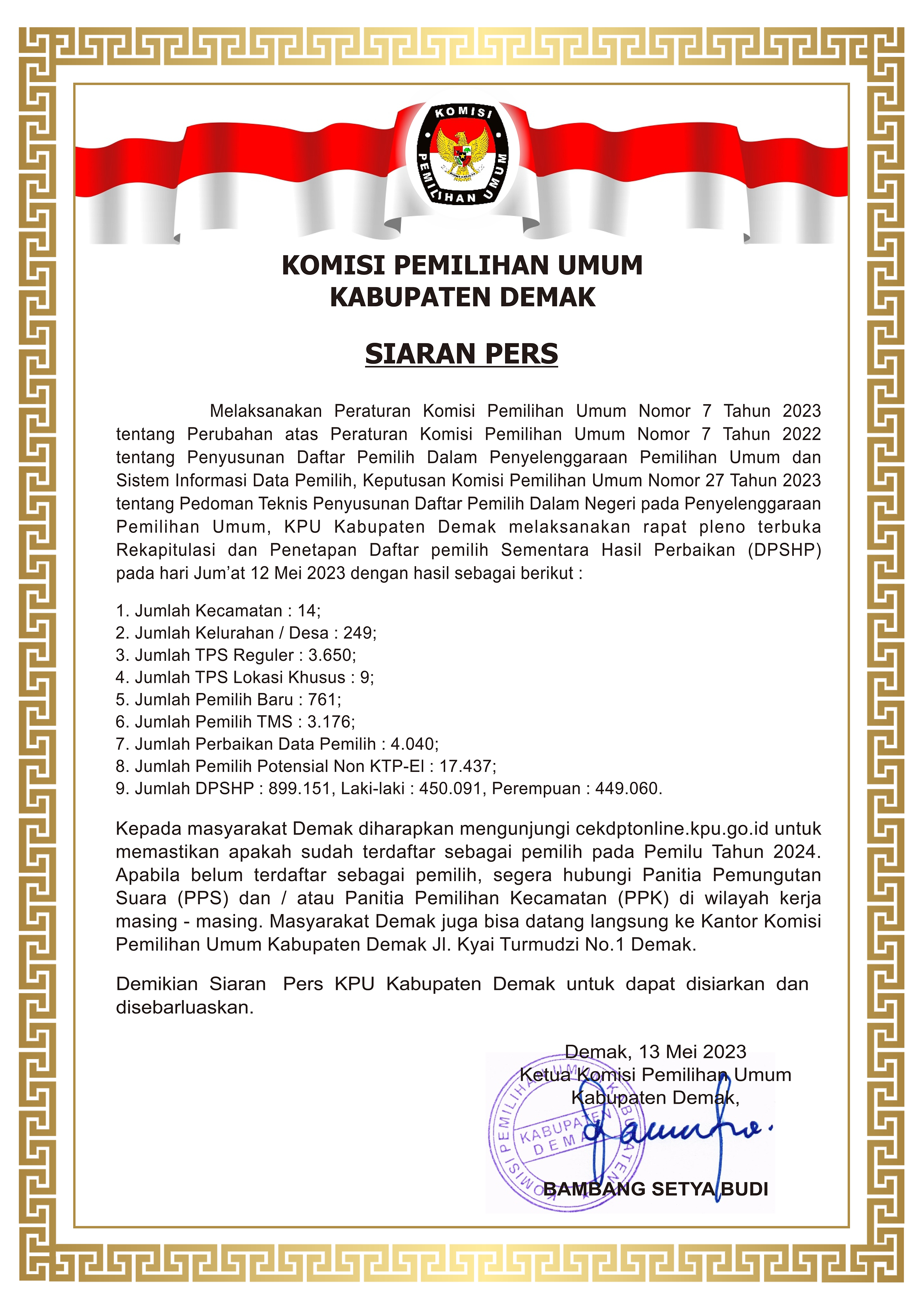 Teman Pemilih, simak siaran pers Rapat Pleno Terbuka Rekapitulasi dan Penetapan Daftar Pemilih Sementara Hasil Perbaikan (DPSHP) Pemilihan Umum Tahun 2024 berikut ini..