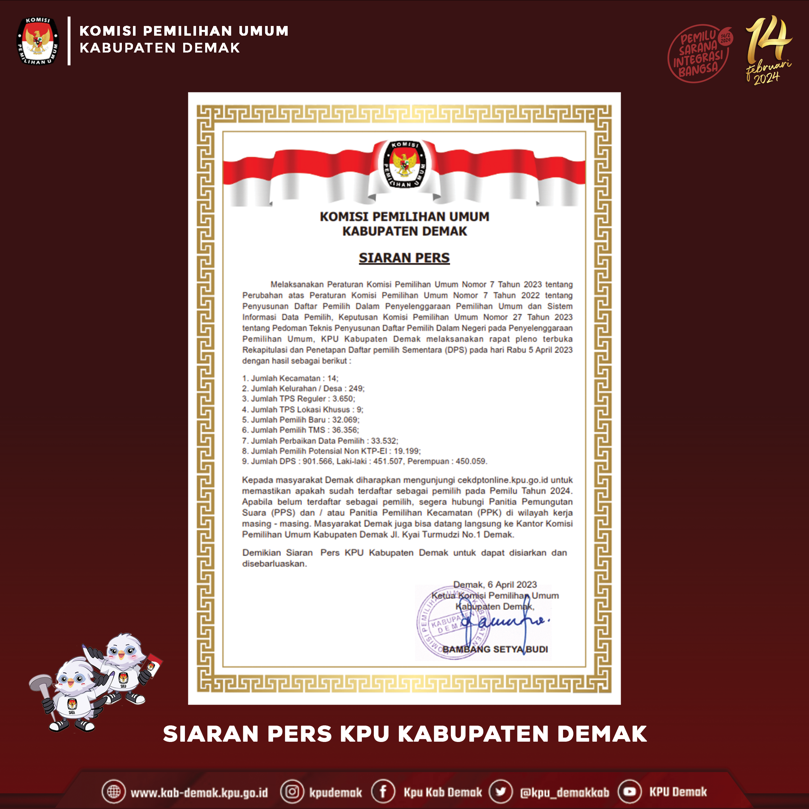 Teman Pemilih, berikut Siaran Pers Rekapitulasi dan Penetapan Daftar Pemilih Sementara (DPS) Pemilu Tahun 2024 di Kabupaten Demak: