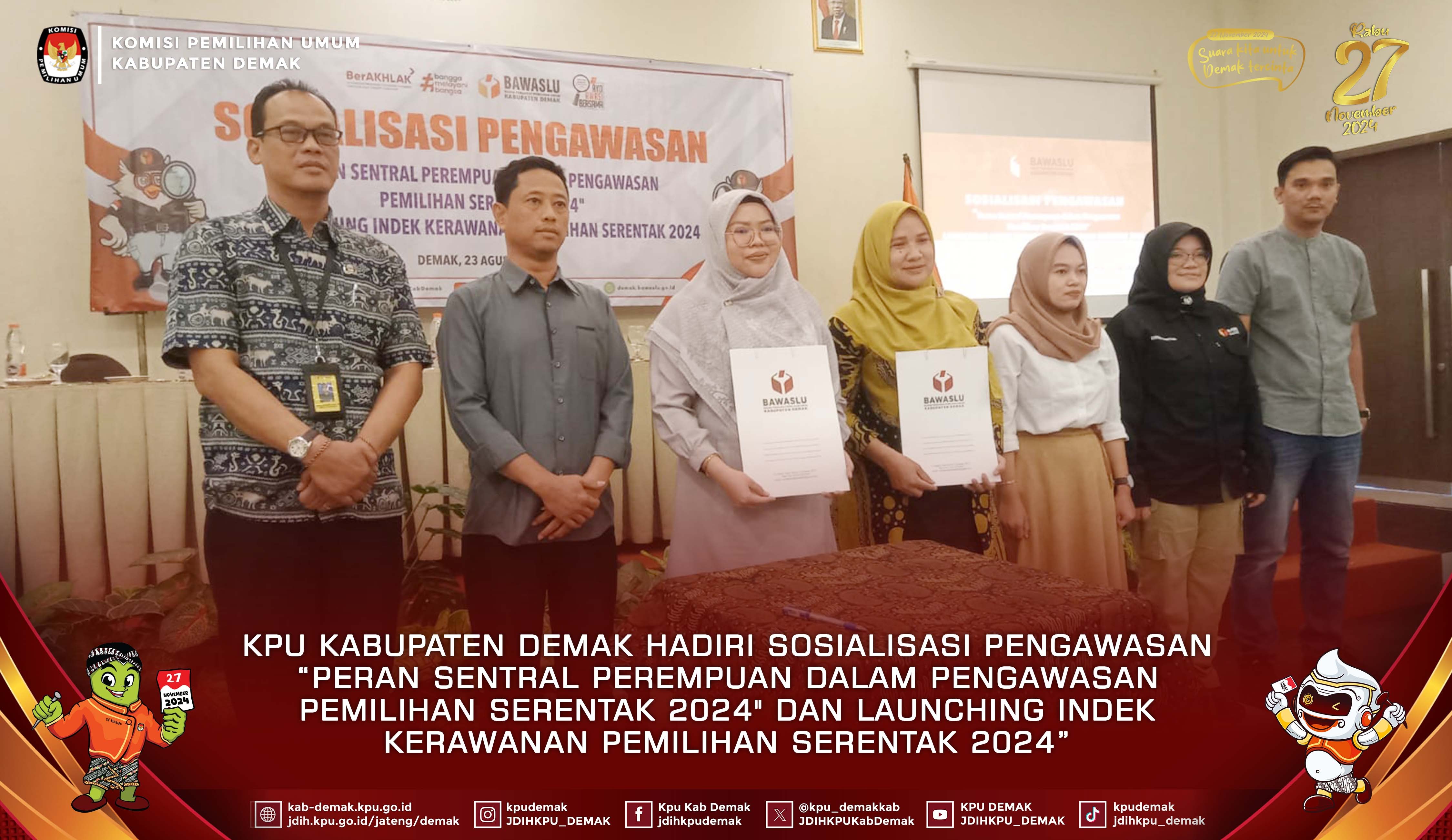 Demak, kab-demak.kpu.go.id - Bawaslu menyelenggarakan kegiatan Sosialisasi Pengawasan "Peran Sentral Perempuan dalam Pengawasan Pemilihan Serentak 2024" dan Launching Indek Kerawanan Pemilihan Serentak 2024. Kegiatan ini hadir dari anggota KPU Demak Devisi Sosdiklih Parmas dan SDM Syariful Imaduddin, Desk Pilkada, Kesbangpol Linmas Demak, Polres Demak, Kodim Demak dan Organisasi Perempuan di Wilayah Demak.