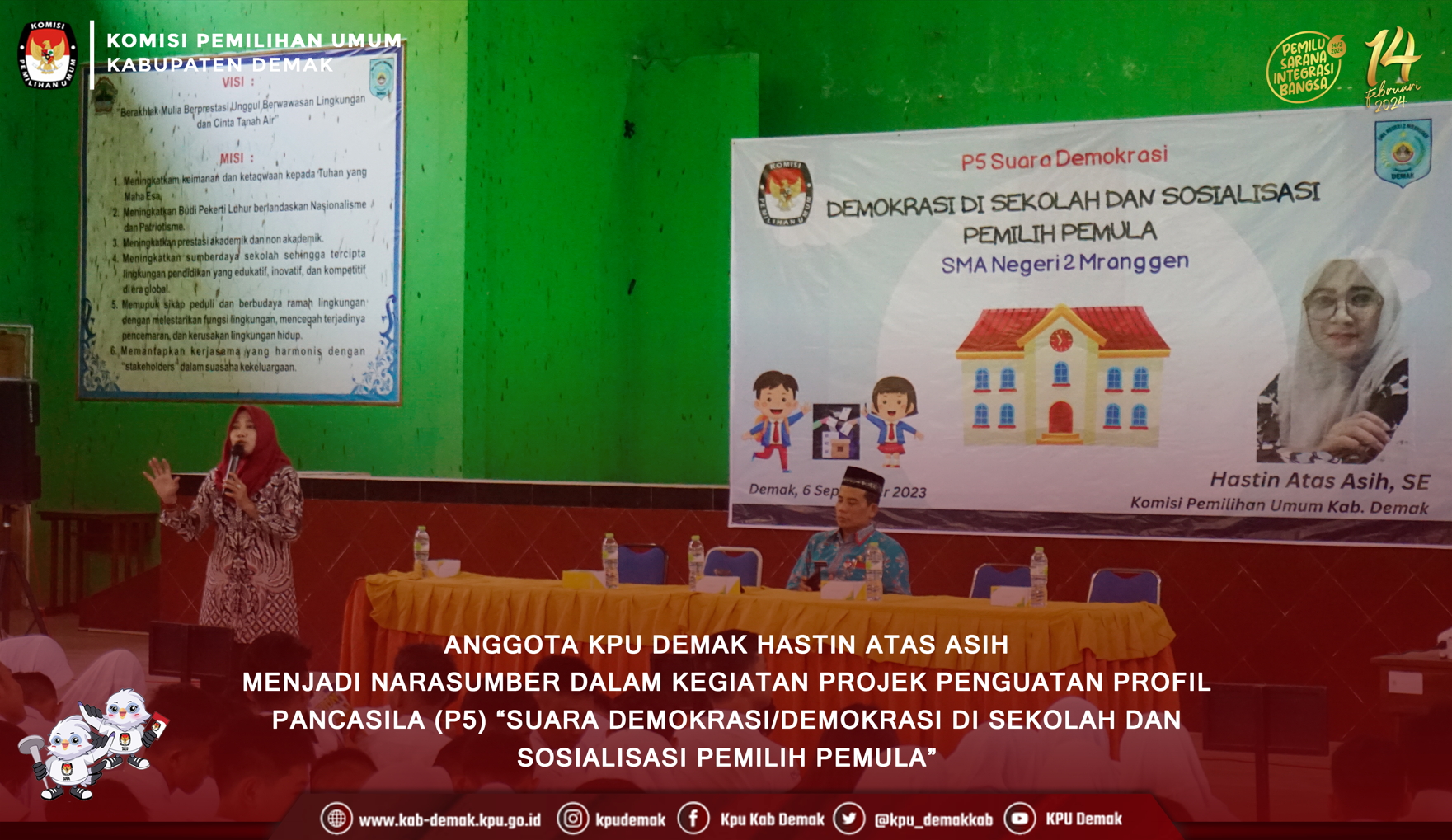 Demak, kab-demak.kpu.go.id (6/9/2023) - KPU Kabupaten Demak mendapat undangan & permohonan sebagai narasumber pada acara Demokrasi & Sosialisasi Pemilu 2024 di SMA Negeri 2 Mranggen Kabupaten Demak.