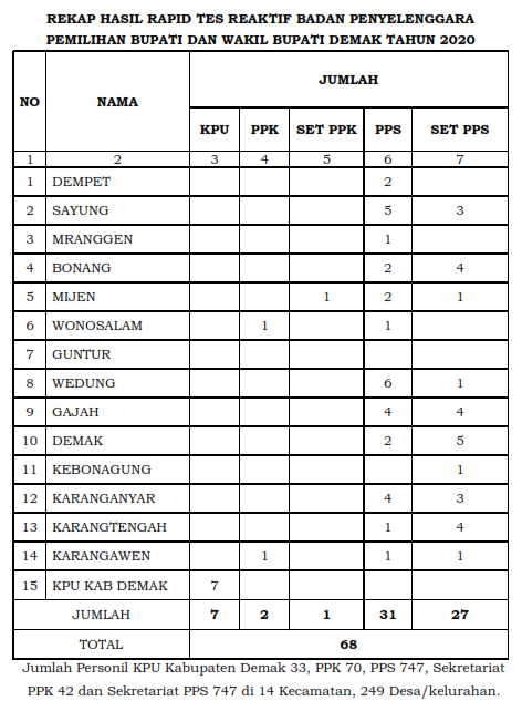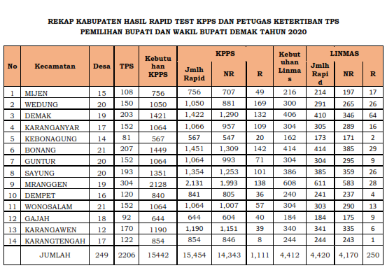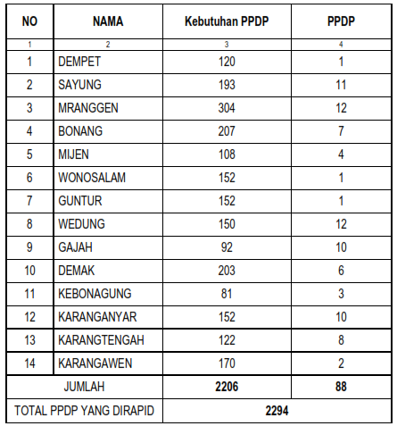 Dari data di atas kebutuhan PPDP di Kabupaten Demak adalah sejumlah 2206 orang. Dilakukan penggantian sebanyak 88 orang dikarenakan hasil pemeriksaan Rapid test/ Swab reaktif. Sehingga total keseluruhan yang melakukan Rapid test/ Swab adalah sebanyak 2.294 orang. Data diatas belum termasuk PPDP yang mengundurkan diri sebelum pelaksanaan Rapid test/ Swab.