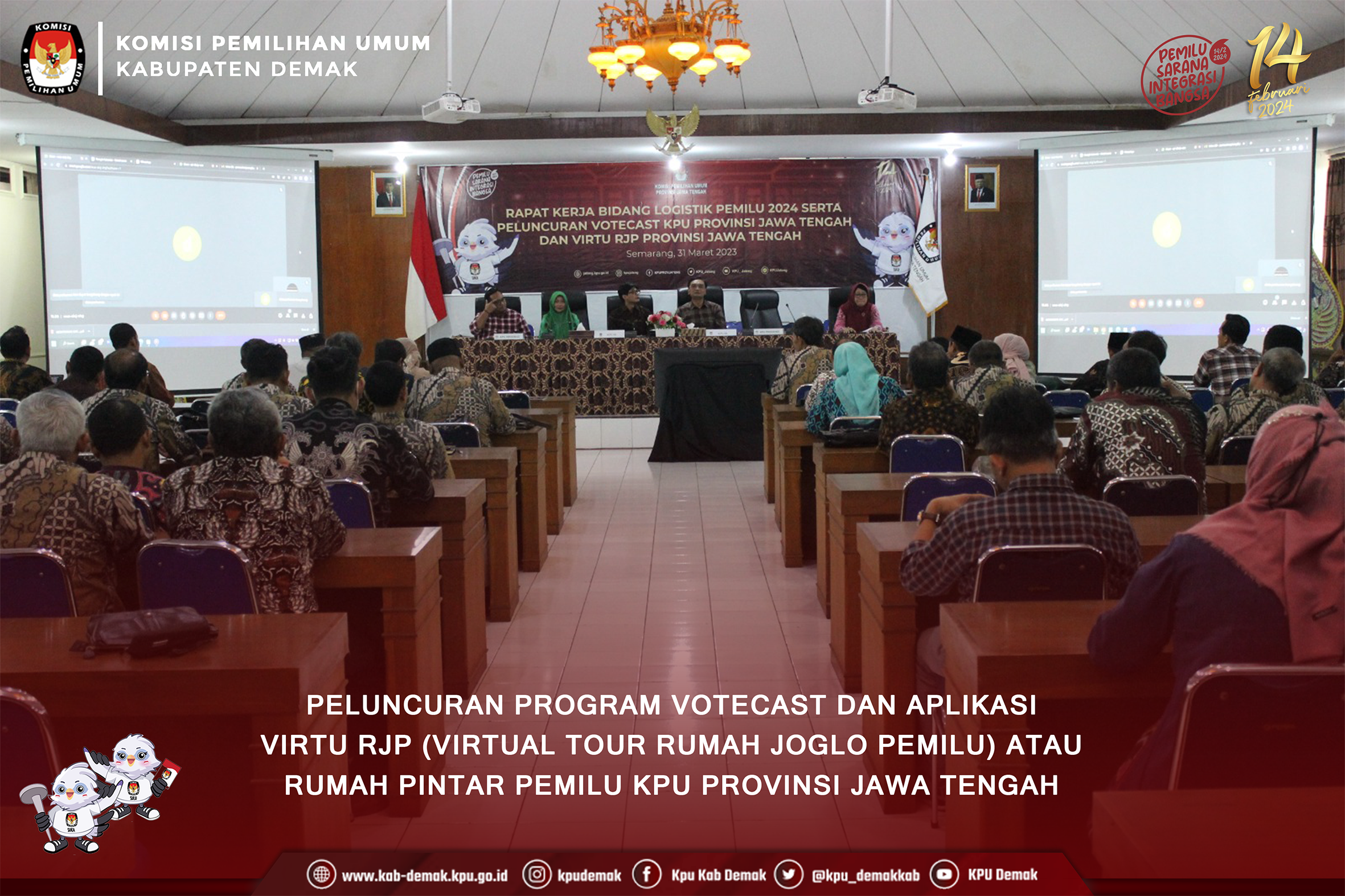 Semarang, kab-demak.kpu.go.id – Peluncuran Program Votecast dan Aplikasi VIRTU RJP (Virtual Tour Rumah Joglo Pemilu) atau Rumah Pintar Pemilu KPU Provinsi Jawa Tengah diresmikan secara langsung oleh Anggota KPU RI August Mellaz dan Yulianto Sudrajat serta disaksikan oleh Ketua, Anggota dan jajaran KPU Provinsi Jawa Tengah, Anggota Komisi Informasi Jawa Tengah Ermy Ardhyanti, media, stakeholder dan 3 orang (Ketua, Divisi Sosdiklih, Sekretaris) dari 35 KPU Kabupaten/Kota pada Jumat (31/3/2023).