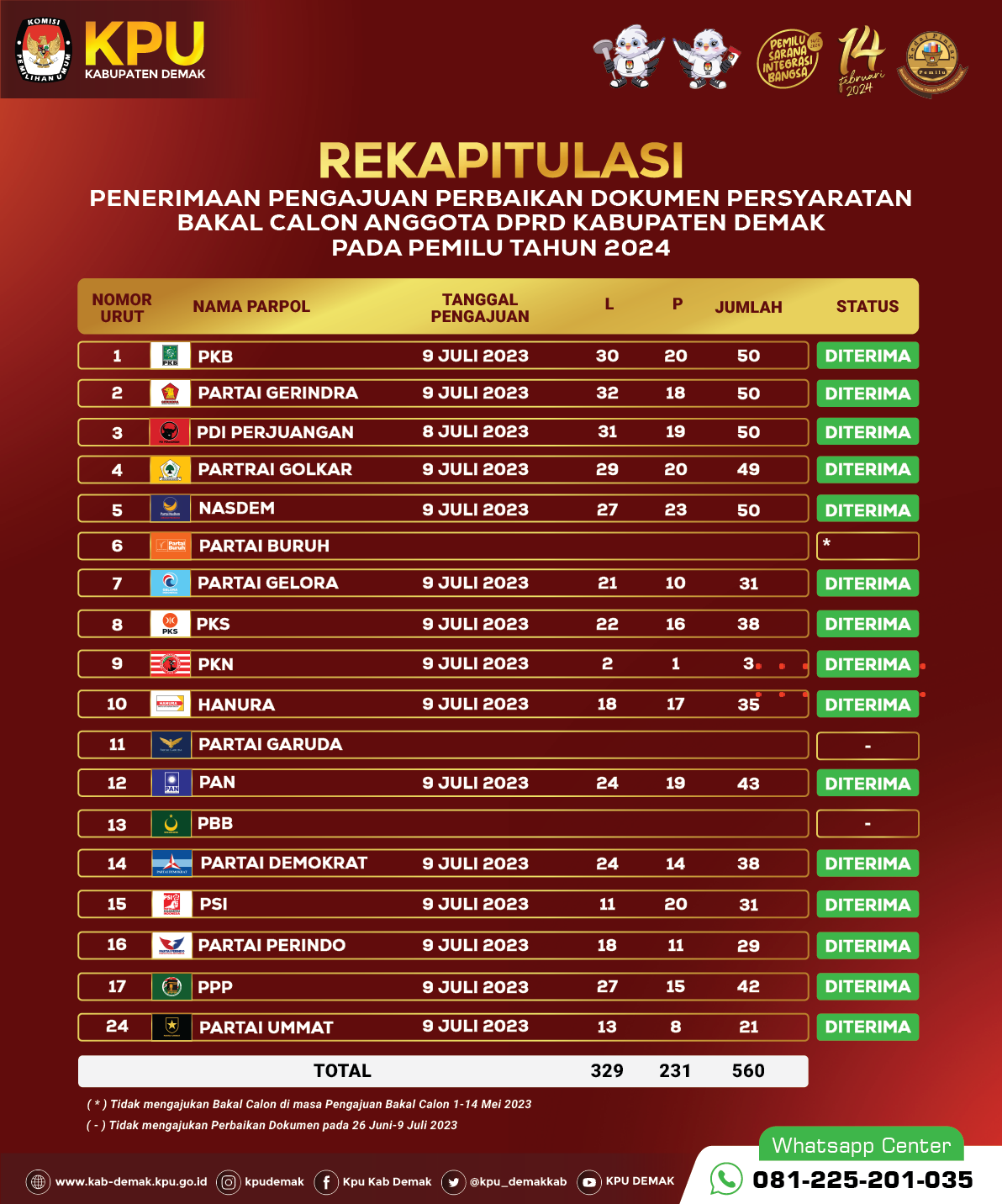 REKAPITULASI PENERIMAAN PENGAJUAN BAKAL CALON ANGGOTA DPRD KABUPATEN DEMAK TAHUN 2024